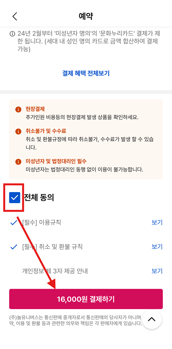 구매하기 클릭 -> 결제내역 확인 후 화면을 내려 결제수단 중 선택 -> '전체동의' 클릭 -> 결제하기 클릭