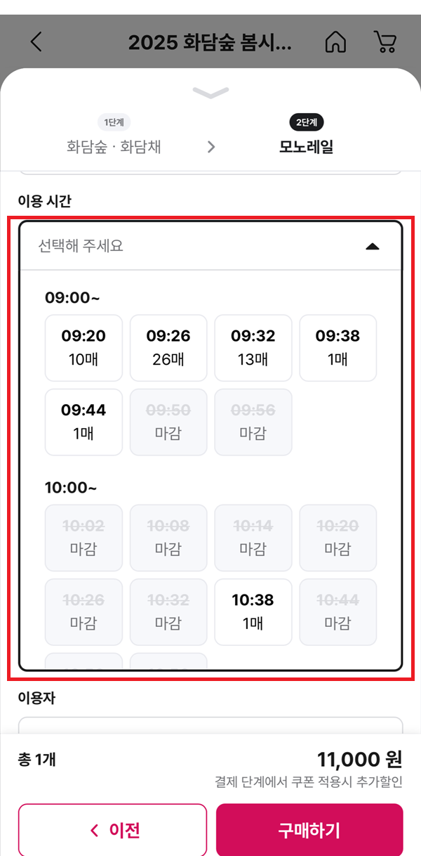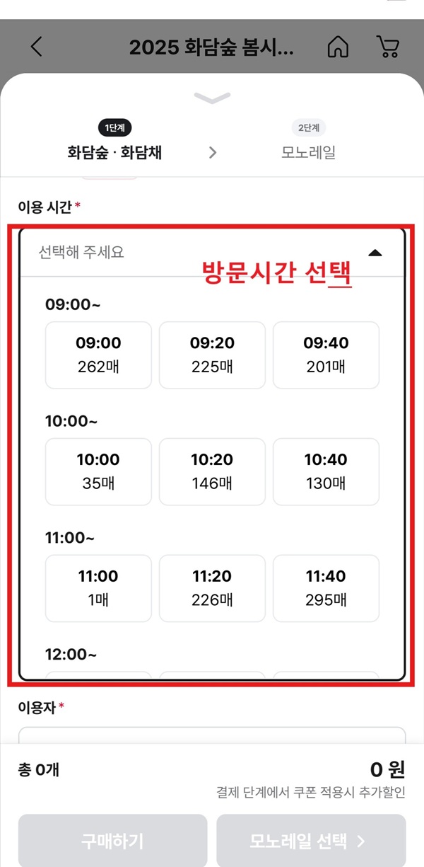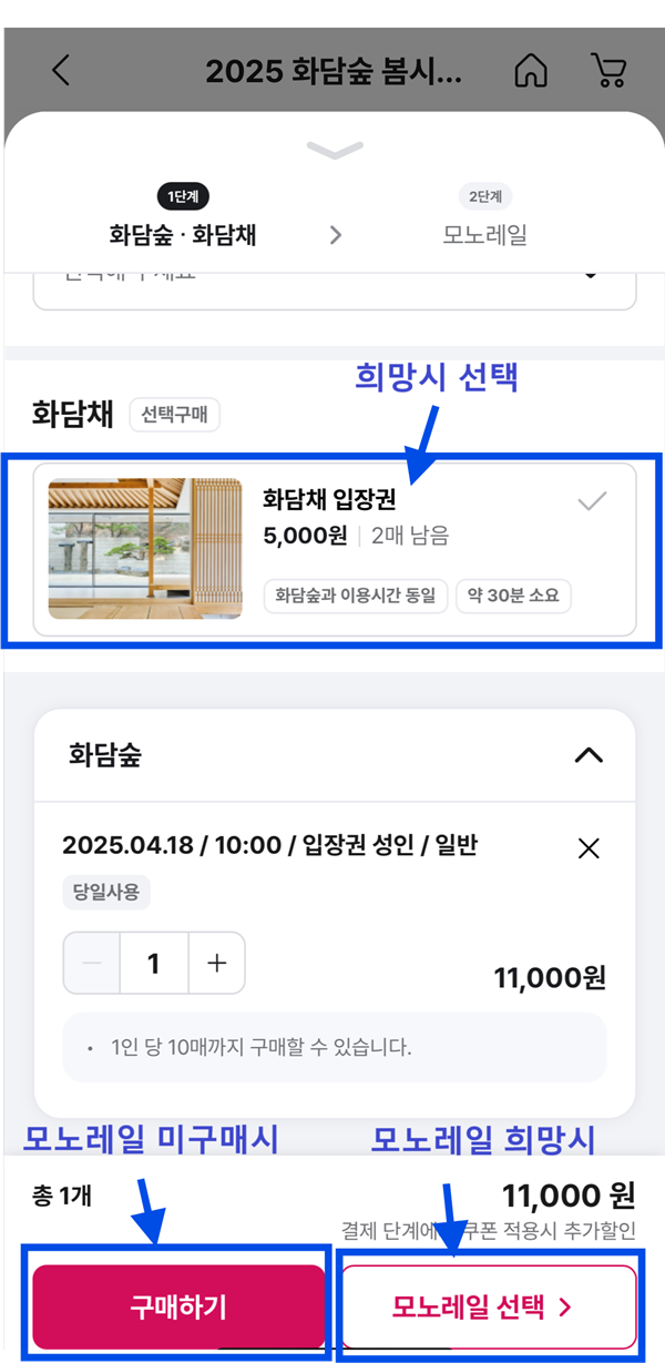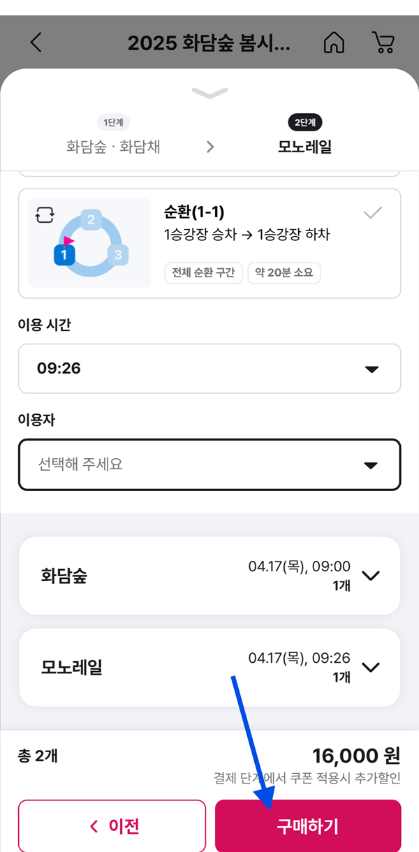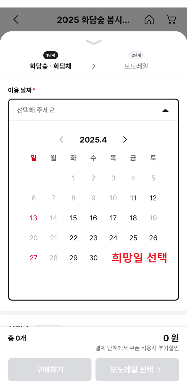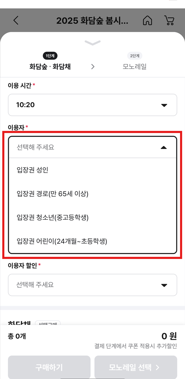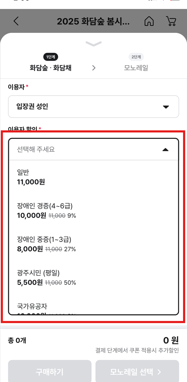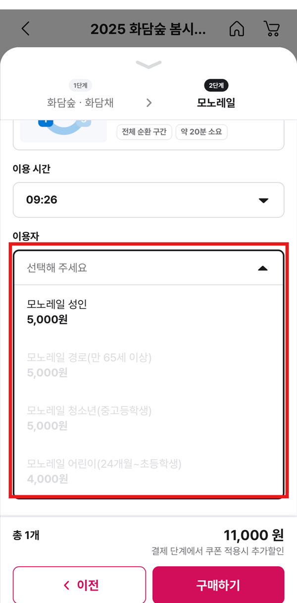 성인, 경로, 청소년, 어린이 중 해당사항 선택 -> 할인 선택 -> 희망시 화담채 및 모노레일 선택(모노레일 안할 경우 '구매하기' 클릭, 모노레일 희망 시 '모노레일 선택' 클릭)