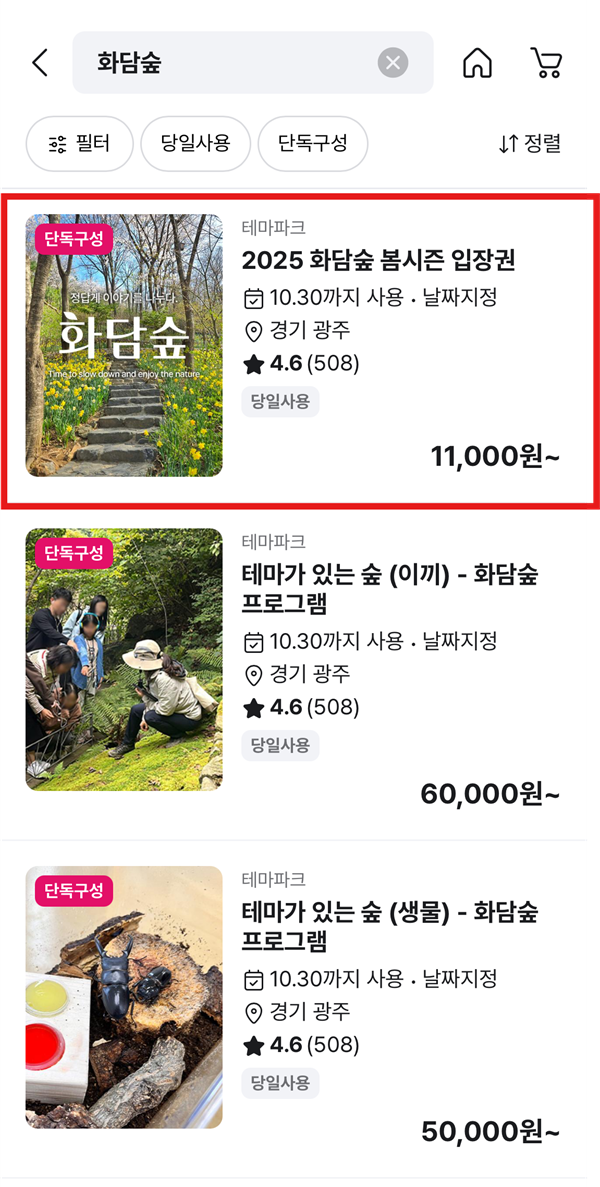 검색 결과에서 화담숲 관련 상품들을 확인하실 수 있습니다. 화담숲 입장권, 모노레일 탑승권 등 원하시는 상품을 선택해주세요. 특히 주말이나 공휴일 방문 예정이라면 미리 서둘러 예약하는 것이 좋습니다!