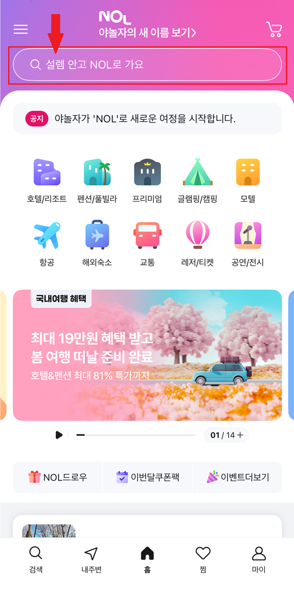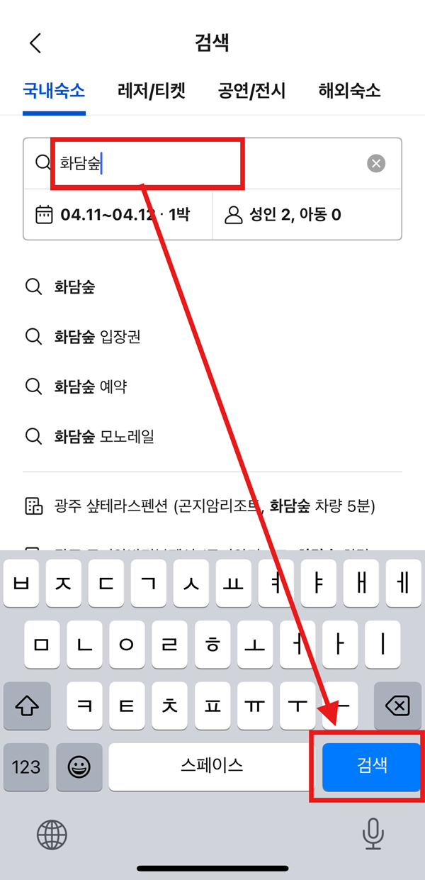 스마트폰에서 야놀자 앱을 실행하신 후, 검색창 클릭 -> "화담숲"을 입력 후 검색버튼 클릭