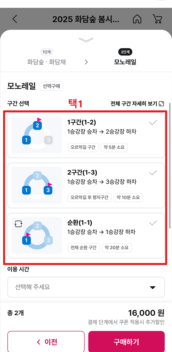 모노레일 종류(3가지) 중 선택 -> 이용시간 선택 -> 이용자 선택